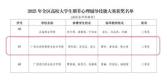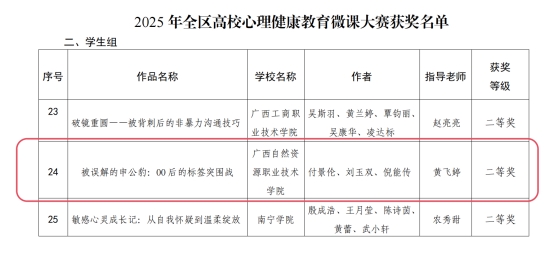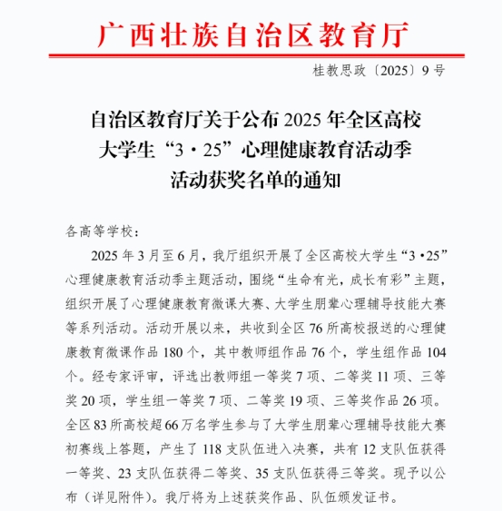 近日,自治区教育厅正式公布了2025年全区高校大学生“3·25”心理健康教育活动季获奖名单。我校学子表现优异,在激烈角逐中脱颖而出,共斩获二等奖一项、三等奖一项。此次获奖,充分展现了我校心理健康教育工作的成效与育人成果。