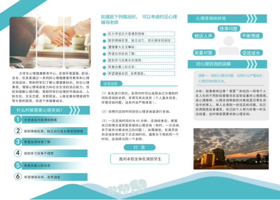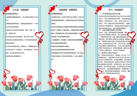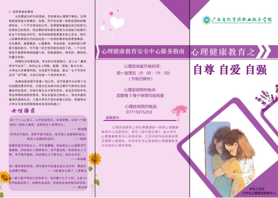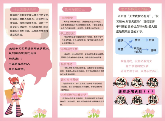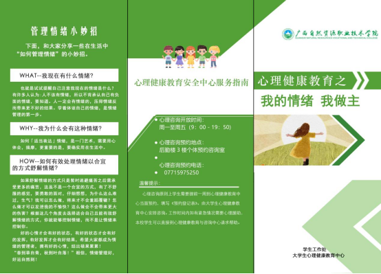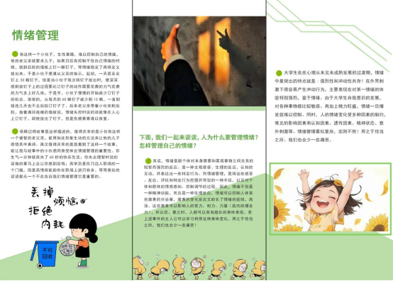 为普及心理健康知识,号召同学们关注心理健康,引导同学们关照自我、疗愈自我,营造“人人关注心理,人人注重健康”的校园氛围,我院学生工作处于2024年4月25日—2024年5月25日组织了“与心灵相约,与健康同行”心理健康知识宣传手册设计大赛。